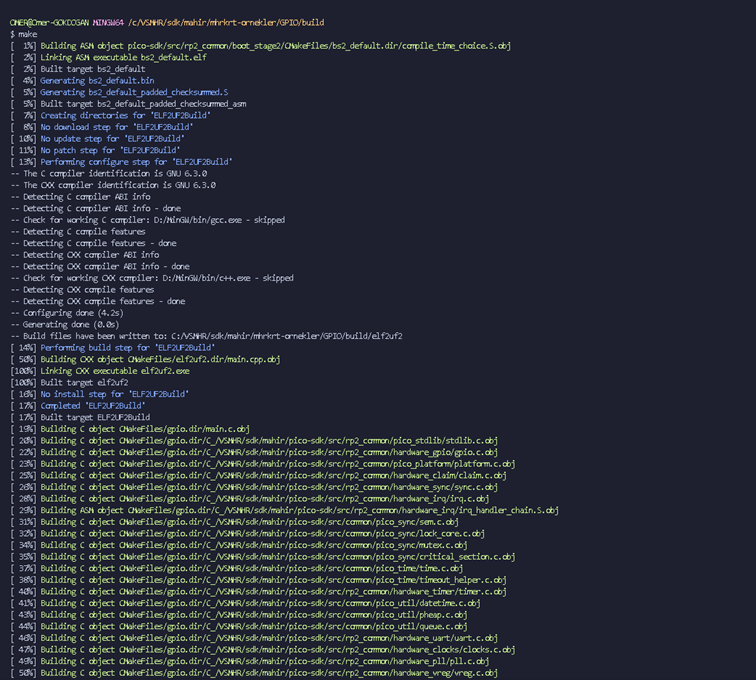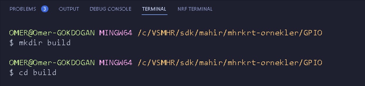 Visual Code’dan terminal açın. Terminaliniz bash olsun. Bulunduğunuz dizin main.c dosyanızla aynı dizinde olmalıdır. Her şey tamam ise şimdi kodlamaya geçelim. İlk olarak Build alacağımız klasörü oluşturalım • mkdir build Ardından build klasörünün içine girelim • cd build
