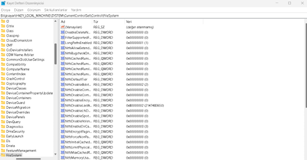 İki kutucuğu da seçtikten sonra “Install Now” a tıklayın. Ardından MAX_PATH uzunluk sınırını devre dışı bırakma işlemi yapacağız. Bunun için Windows arama çubuğuna “Kayıt Defteri Düzenleyicisi” yazın ve ilk çıkana tıklayın. Ekrana aşağıdaki görsel gibi bir ekran gelecektir.