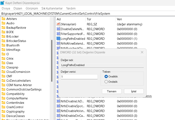 Yukarıdaki yola gittiğinizde önünüze bu sayfa gelecektir. Bu sayfadanda okla gösterilen LongPathEnabled ‘a tıklayıp önünüzde açılan pencerede aşağıdaki seçenekleri yapın ve Tamam’a basın.