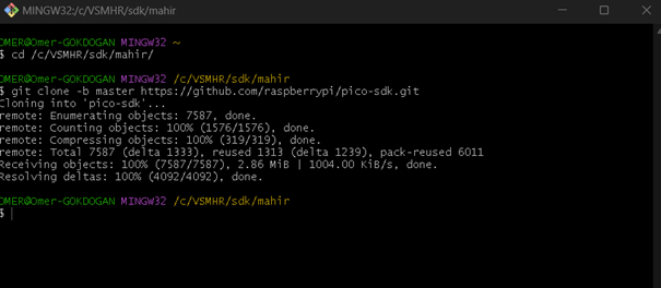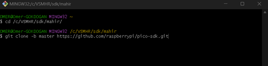 git clone -b master https://github.com/raspberrypi/pico-sdk.git bunu yazıp enter’a bastığımızda birkaç indirme işlemi yapacak.