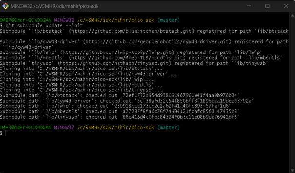 Ardından “pico-sdk” klasörüne gidip sub modülleri indireceğiz. Bunun içinde aşağıdaki kodları yazın.