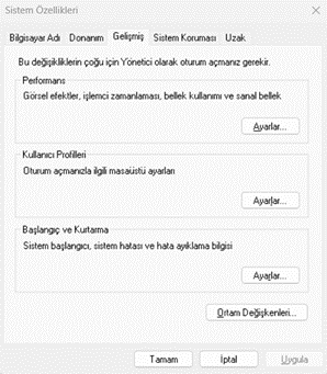 Windows arama çubuğuna “Sistem ortamı değişkenlerini düzenle” yazın ve ilk çıkana tıklayın. Karşınıza alttaki gibi bir ekran gelecek. Bu pencerede “Ortam Değişkenleri..” butonuna basın