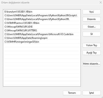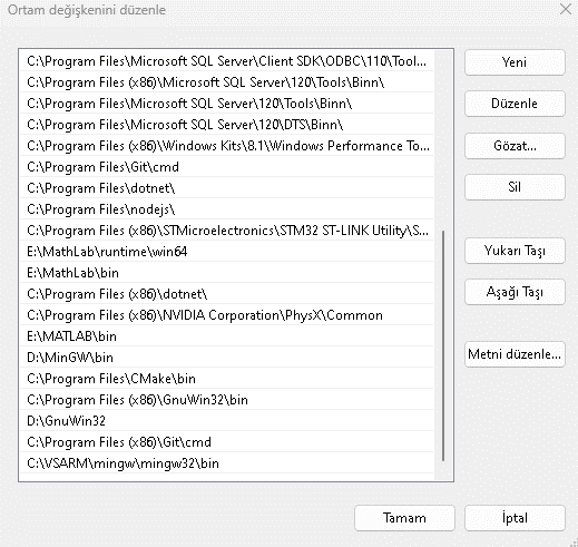 Düzenle dedikten sonra gelen ekranda sağ üstten Yeni’ye tıklayıp C:\VSMHR\mingw\mingw32\bin bunu yazın ve tamam diyin. Ayrıca yine bu ekranda
