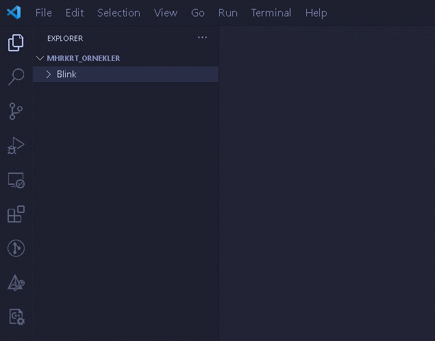 Ardınan Visual Code programına girip File kısmına tıklayıp Open Folder’a basıp mhrkrt_ornekler klasörünü seçin. Bu klasörde iken tekrardan bir klasör açın ve adını Blink koyun.