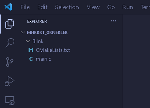 Ardından Blink klasörü içine main.c dosyasını oluşturun. Main.c dosyasını kodlamaya başlayalım. Blink için kodlama şu şekildedir.