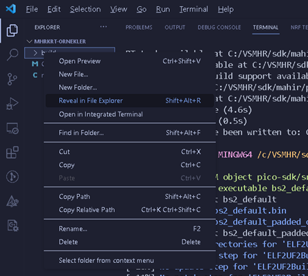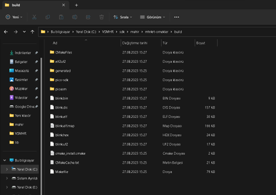 Bu işlemler sonucunda Mahir Kart içine atacağımız blink.uf2 dosyası oluşuyor. Şimdi bu dosyayı kartımızın içine atalım. Build klasörünün üstüne sağ tık yapıp “ Reveal in File Explorer”