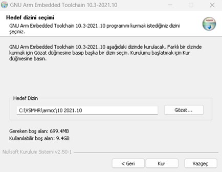 "C:\VSMHR\armcc" bu yolu seçtiğinizde ise “Hedef Dizin” kutusu aşağıdaki gibi olacaktır. (İndirdiğiniz sürüme bağlı olarak armcc\ den sonraki kısım değişiklik gösterecektir.)