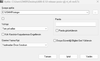 İndirdiğiniz .zip dosyasını C:\VSMHR\mingw dizinine çıkartın.